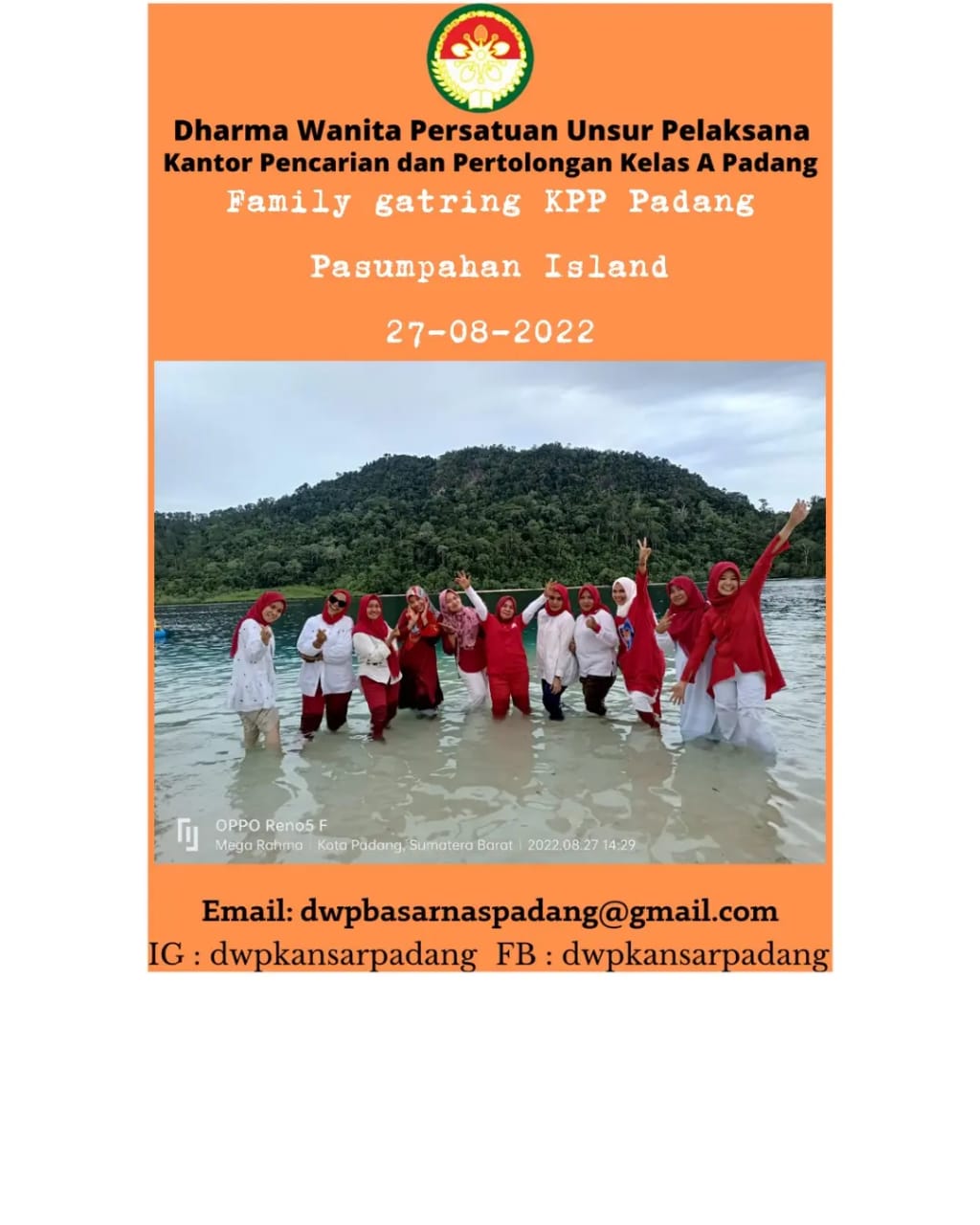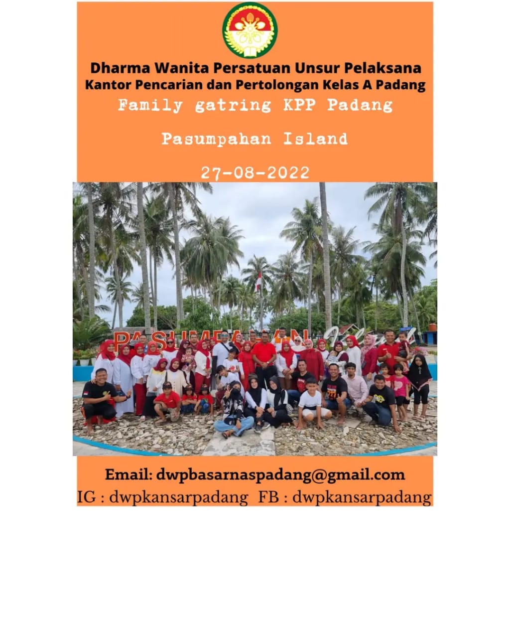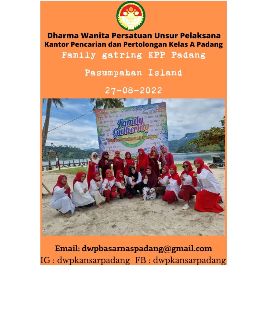Pada hari Sabtu tanggal 27 Agustus 2022 Keluarga Besar DWP UP Kantor Pencarian dan Pertolongan Padang mengikuti kegiatan Family Gatering di Pulau Pasumpahan, yang di ikuti oleh 18 orang pengurus dan anggota