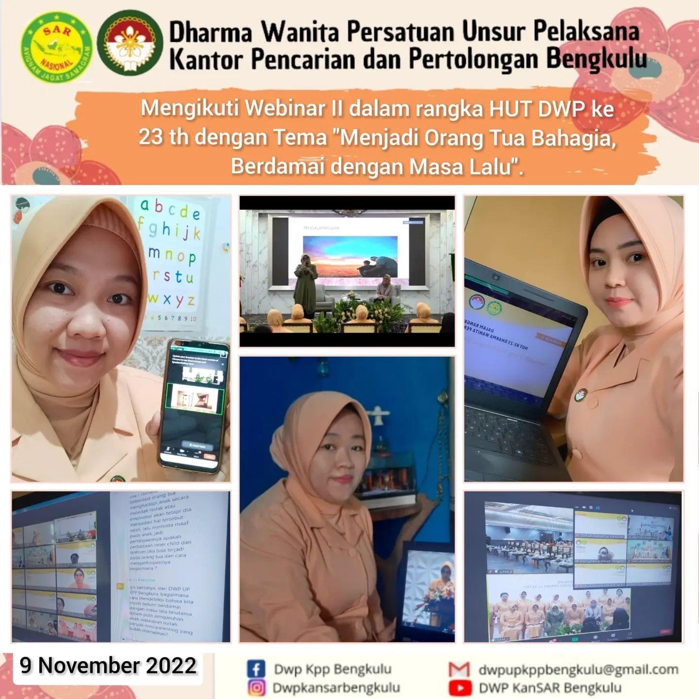Rabu, 9 November 2022 Pengurus DWP UP KPP Bengkulu beserta anggota mengikuti Webinar II dalam rangka HUT DWP ke 23 tahun yang di selenggarakan oleh DWP Basarnas Pusat. Dengan Tema " Menjadi Orang Tua Bahagia, Berdamai dengan Masa Lalu "narasumber Ny. Erina Rusdian Sari Moderator Ny. Esi Febriana.