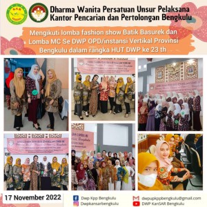Kamis, 17 November 2022 DWP UP KPP Bengkulu Mengikuti lomba Fashionshow Batik Basurek dan lomba MC se DWP OPD/instansi Vertikal Provinsi Bengkulu yang diwakili oleh Ny. Debora Hicron dan Ny. Sefty Idham, dalam rangka HUT DWP ke 23 th diselenggarakan oleh DWP Provinsi Bengkulu di ruang serba guna Pemda Bengkulu.