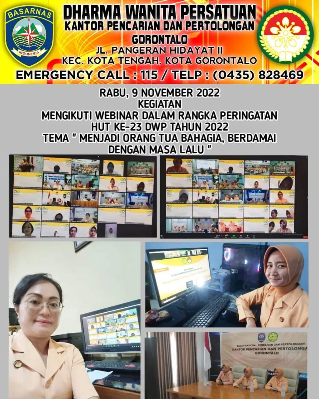 Rabu, 9 November 2022 Kegiatan DWP UP KPP (BASARNAS) Gorontalo : Dharma Wanita Persatuan Kantor Pencarian dan Pertolongan Gorontalo mengikuti Webinar dalam rangka peringatab HUT ke -23 DWP tahun 2022 Tema "Menjadi Orang tua bahagia, berdamai dengan masa lalu "