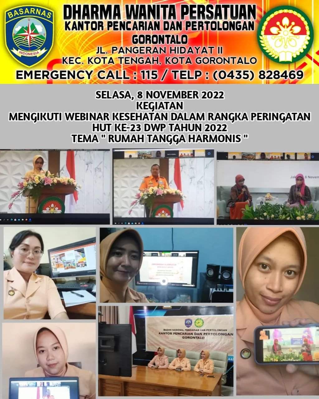 Selasa, 8 November 2022 Kegiatan DWP UP KPP (BASARNAS) Gorontalo : Dharma Wanita Persatuan Kantor Pencarian dan Pertolongan Gorontalo mengikuti Webinar kesehatan dalam rangka peringatan HUT ke-23 DWP tahun 2022 Tema " Rumah tangga harmonis ".
