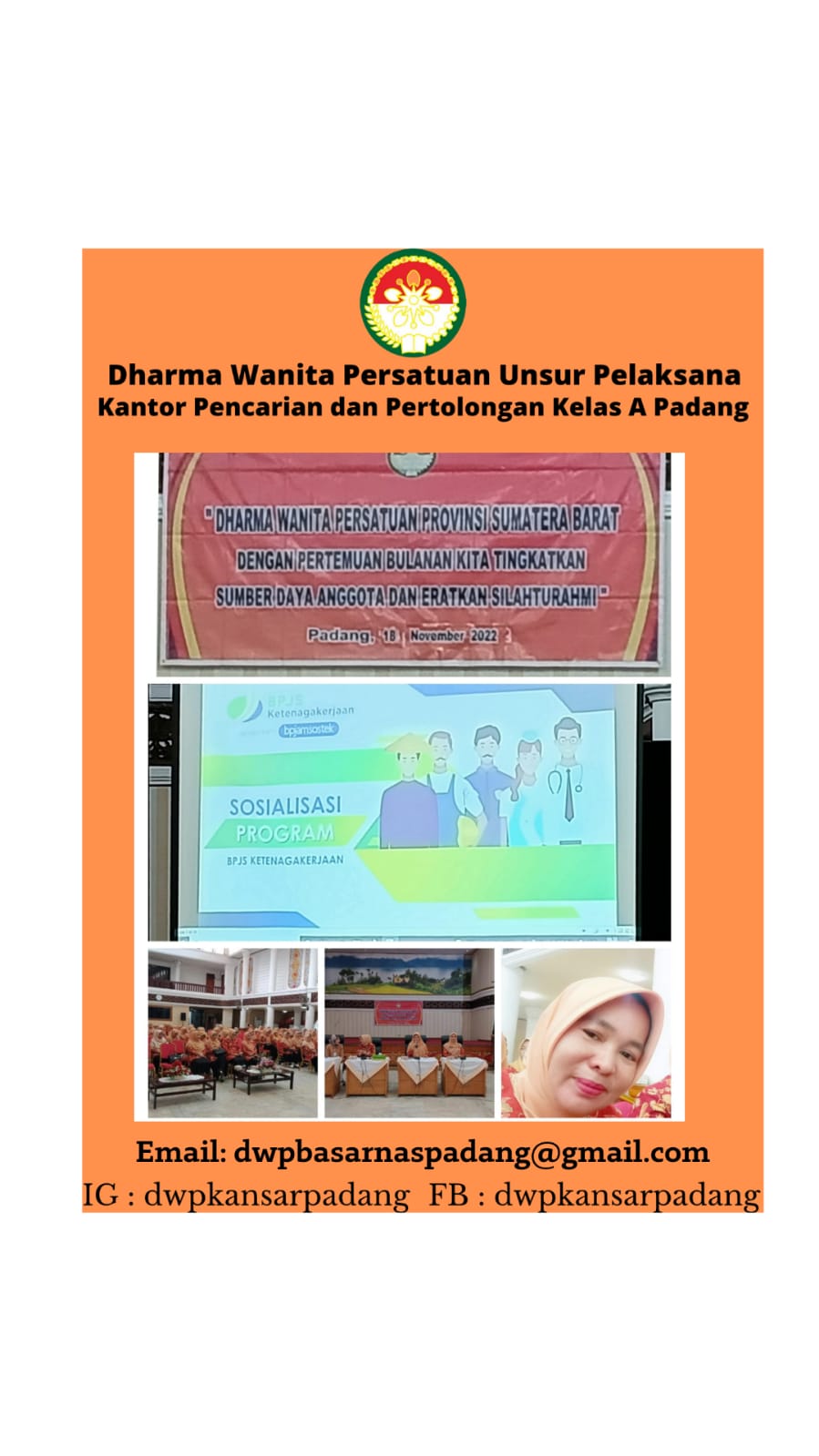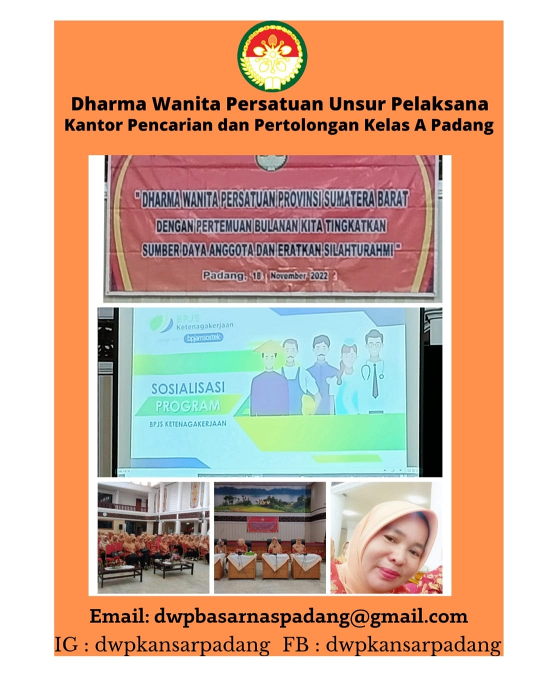 Jumat, tanggal 18 November 2022 ketua DWP UP KPP Padang beserta 2 orang pengurus menghadiri pertemuan rutin bulanan DWP Prov. Sumatera Barat dg tema Sosialisasi BPJS ketenagakerjaan, bertempat di aula kantor gubernur Sumatera Barat