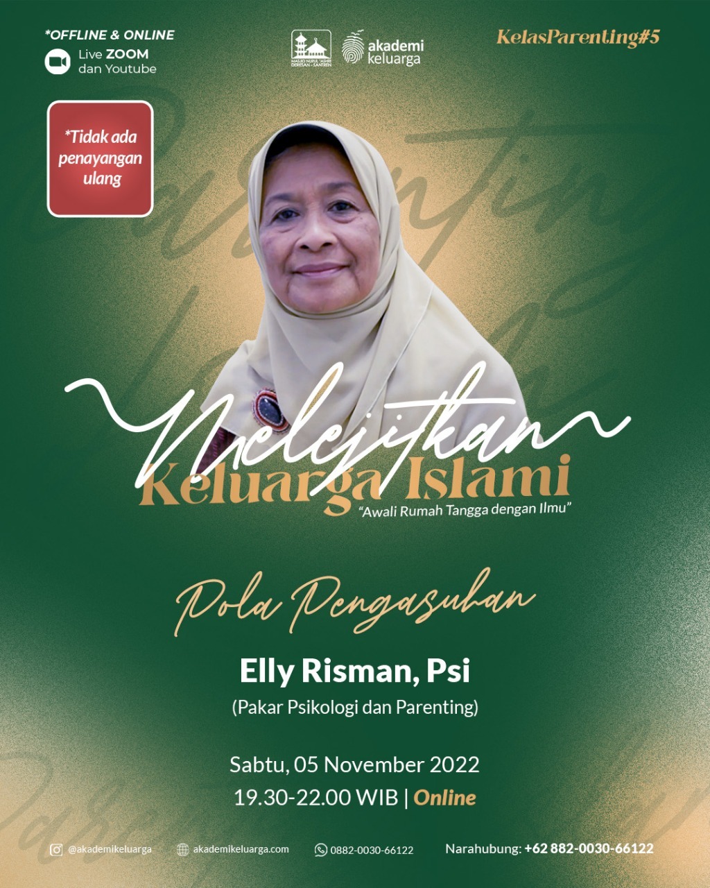 DWP UP balai Diklat mengikuti webinar MELEJITKAN KELUARGA ISLAMI Sabtu, 5 November 2022 dengan narasumber ibu Elly Risman, Psi Pakar Psikologi dan Parenting dengan judul "POLA PENGASUHAN" Dengan peserta : 1. Ny. Nur Rudy 2. Ny. Susi Dika 3. Ny. Azizah Taufik 4. Ny. Desy dade 5. Ny. Icha Tatar