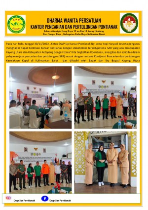Pada hari Rabu tanggal 30/11/2022...Ketua DWP Up Kansar Pontianak Ny. arma Yopi Haryadi beserta pengurus menghadiri Rapat Kordinasi Kansar Pontianak dengan stakeholder terkait/potensi SAR yang ada dikabupaten Kayong Utara dan Kabupaten Ketapang dengan tema" Kita tingkatkan Koordinasi, sinergitas dan soliditas dalam pelayanan jasa pencarian dan pertolongan (SAR) sesuai dengan rencana Kontijensi Pencarian dan pertolongan Kecelakaan Kapal di Kalimantan Barat dan dihadiri oleh Bapak dan ibu Bupati Kayong Utara