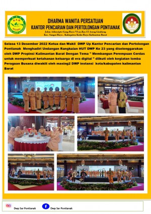 Selasa 13 Desember 2022 Ketua dan Wakil DWP Up Kantor Pencarian dan Pertolongan Pontianak Menghadiri Undangan Rangkaian HUT DWP Ke 23 yang diselenggarakan oleh DWP Propinsi Kalimantan Barat Dengan Tema " Membangun Perempuan Cerdas untuk memperkuat ketahanan keluarga di era digital " diikuti oleh kegiatan lomba peragaan Busana diwakili oleh masing2 DWP instansi kota/kabupaten kalimantan Barat