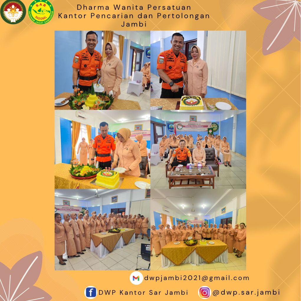Selasa, 20 Desember 2022. Bertempat di Kantor Pencarian dan Pertolongan Jambi, Ketua DWP UP KPP Jambi Ibu Fatmawati Kornelis dan Penasehat DWP UP KPP Jambi Bpk. Kornelis beserta para Pengurus dan Anggota DWP UP KPP Jambi mengikuti puncak peringatan HUT Dharma Wanita Persatuan ke-23 serta pemotongan tumpeng secara Virtual.