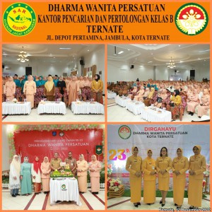 Tanggal, 12 Desember 2022 DWP UP. Kantor Pencarian dan Pertolongan Ternate menghadiri acara peringatan HUT Dharma Wanita Persatuan ke 23, yang diselenggarakan oleh DWP Kota Ternate bertempat di Ballrom Jati Hotel Ternate. Acara dihadiri oleh Penasehat DWP yaitu Bapak Dr. M. Tauhid Soleman,M.Si dan Ny. Marliza Marsaoly. Di ikuti oleh 5 orang Anggota DWP.