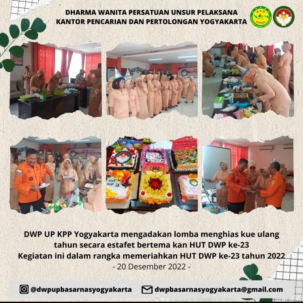 Selasa, 20 Desember 2022, Dharma Wanita Persatuan Unsur Pelaksana Kantor Pencarian dan Pertolongan Yogyakarta Mengadakan Lomba Menghias Kue Ulang Tahun Secara Estafet bertemakan HUT DWP ke - 23, dalam rangka memeriahkan HUT DWP ke -23 tahun 2022