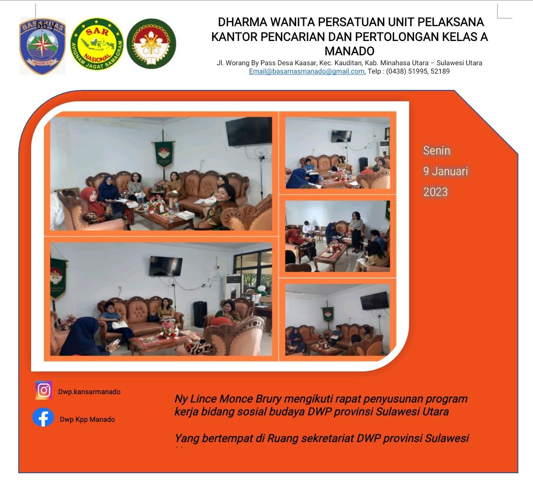 Tgl 9 Januari 2023 Ketua DWP UP KPP Manado Ny Lince Monce Brury mengikuti rapat penyusunan program kerja bidang sosial budaya DWP provinsi Sulawesi Utara Yang bertempat di Ruang sekretariat DWP provinsi Sulawesi Utara