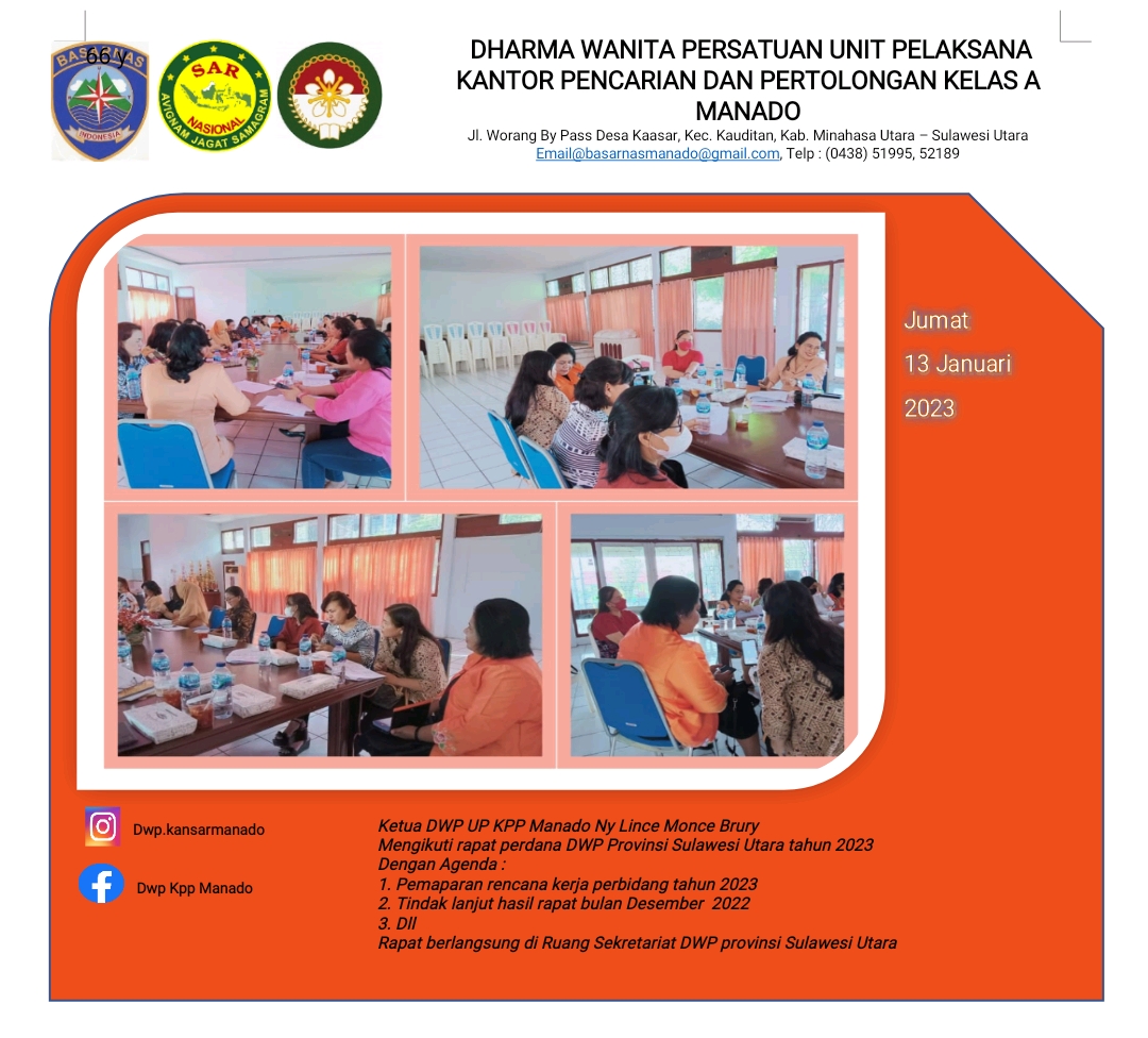 Pada tanggal 13 Januari 2023 Ketua DWP UP KPP Manado Ny Lince Monce Brury Mengikuti rapat perdana DWP Provinsi Sulawesi Utara tahun 2023 Dengan Agenda : 1. Pemaparan rencana kerja perbidang tahun 2023 2. Tindak lanjut hasil rapat bulan Desember 2022 3. Dll Rapat berlangsung di Ruang Sekretariat DWP provinsi Sulawesi Utara