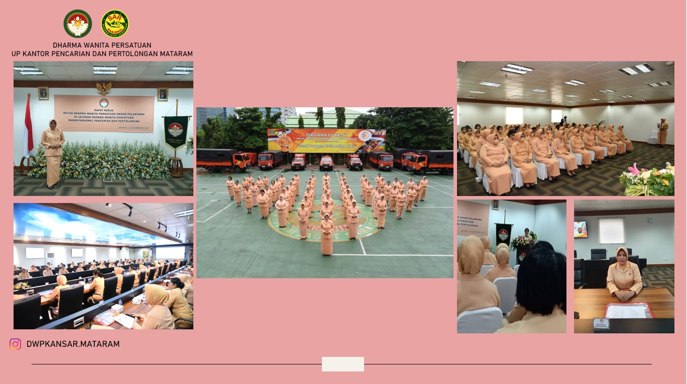 Pada tanggal 14 Februari 2023, Ketua DWP UP Kantor Pencarian dan Pertolongan Mataram mengikuti Pembukaan Rapat Kerja DWP Unsur Pelaksana di Jajaran Dharma Wanita Persatuan Badan Nasional Pencarian dan Pertolongan yang dibuka langsung Oleh Ketua Dharma Wanita Persatuan Basarnas dan dihadiri oleh Seluruh Ketua Unsur Pelaksana se- Indonesia dilaksanakan di Ruang Rapat Lantai 2 Gedung Basarnas Jakarta