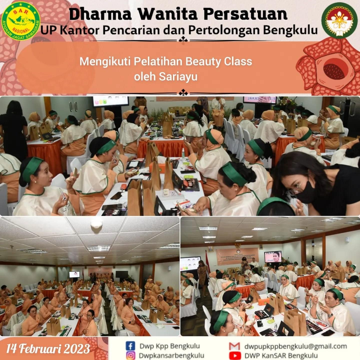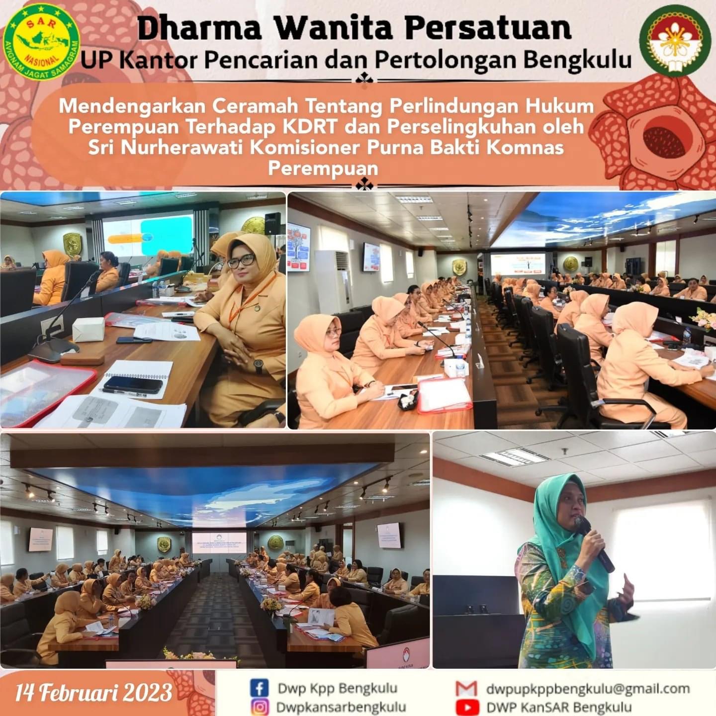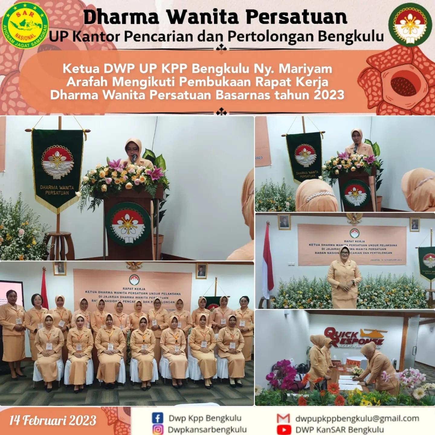 Selasa, 14 Februari 2023 Ketua DWP UP Kantor Pencarian dan Pertolongan Bengkulu Ny. Mariyam Arafah Menghadiri Undangan Rapat kerja Dharma Wanita Persatuan Badan Nasional Pencarian dan Pertolongan tahun 2023, yang di ikuti oleh Seluruh Ketua DWP UP Kantor Pencarian dan Pertolongan se-Indonesia, dilakasanakan pada tgl 14-16 februari 2023,berlokasi di gedung Basarnas, Kemayoran Jakarta pusat. Rangkaian kegiatan Rapat Kerja tgl 14 Februari 2023, 1. Foto Bersama dengan Ketua dan Pengurus DWP Badan Nasional Pencarian dan Pertolongan beserta seluruh Ketua DWP UP Kantor Pencarian dan Pertolongan se-Indonesia. 2. Pembukaan Rapat Kerja DWP Badan Nasional Pencarian dan Pertolongan tahun 2023 oleh Ibu Santi Henri Alfiandi 3. Mendengarkan Ceramah Tentang Perlindungan Hukum Perempuan Terhadap KDRT dan Perselingkuhan oleh ibu Sri Nurherawati Komisioner Purna Bakti Komnas Perempuan. 4. Pelatihan Beauty Class oleh Sariayu