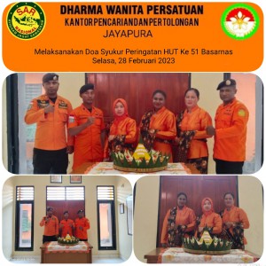 Pada hari Selasa, 28 Februari 2023, DWP UP KPP Jayapura yang berada di Pos Sar Sarmi melaksanakan Doa Syukur atas Peringatan HUT ke 51 Basarnas, dilanjutkan dengan pemotongan tumpeng dan dihadiri 3 anggota.
