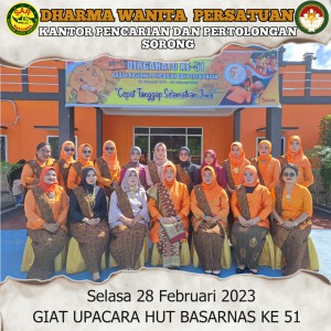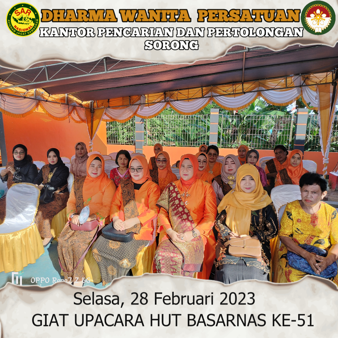 Selasa, 28 Februari 2023, Ketua DWP Kantor Pencarian dan Pertolongan Sorong Ny Yenny Amiruddin bersama Wakil Ny Rosna Muslikun bersama 17 orang anggota lainnya menghadiri Upacara Peringatan HUT Ke-51 Basarnas yang diselenggarakan oleh Kantor Pencarian dan Pertolongan Sorong bertempat di Lapangan Kantor Pencarian dan Pertolongan Sorong.